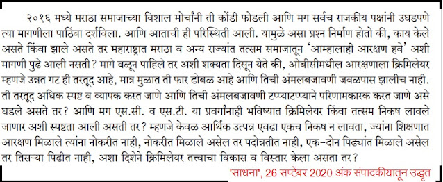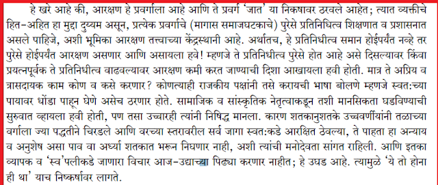 खूप व्यवस्थित मुद्देसूद लिहिले आहे, सवर्ण लोक 70 वर्षे आरक्षण दिले म्हणून ओरडत आहेत, जेवढं आरक्षण मंजूर झालं त्यातील 20% सुद्धा मिळालं नाही, हजारो वर्षे शिक्षण न मिळालेल्या समाजांना साधं प्राथमिक शिक्षण घेणेच शक्य नाही झालं तर त्या आरक्षणाचा फायदा तरी त्यांना कसा मिळणार, निदान पुढची 100-200 वर्षे आरक्षण हवंय, सर्वात महत्वाचे राजकिय आरक्षण मिळाले पाहिजे