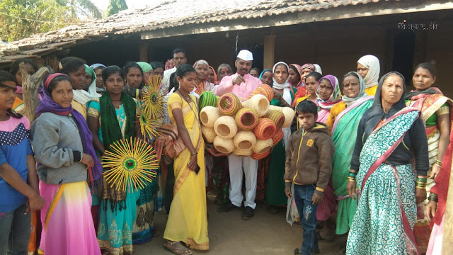 महिला बचत गटात बांबूच्या वस्तू बनवतात. |